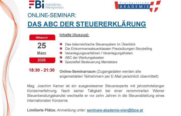 Das Freiheitliche Bildungsinstitut lädt zum Online-Seminar „Das ABC der Steuererklärung“ ein, das einen strukturierten Überblick über das österreichische Steuersystem sowie zentrale Aspekte der Einkommensteuer, Veranlagungsverfahren und Werbungskosten vermittelt und dabei sowohl theoretische Grundlagen als auch praxisnahe Anwendungsbeispiele behandelt. Der Vortrag wird von Mag. Joachim Karner, einem erfahrenen Steuerexperten mit langjähriger Tätigkeit in der Steuerberatung und Konzernpraxis, durchgeführt und richtet sich an alle Interessierten, die ihre Kenntnisse im Bereich der Steuererklärung vertiefen möchten.